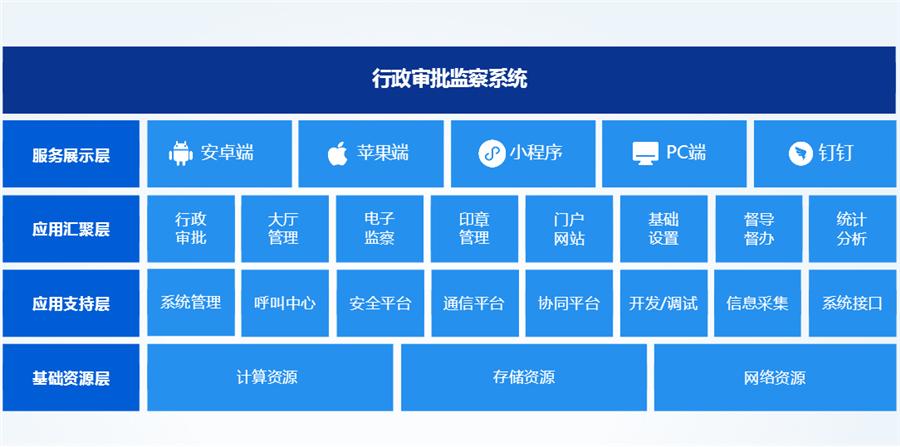 该系统包括行政审批系统/大厅管理系统/电子监察系统/印章管理系统/门户网站系统/基础设置系统。