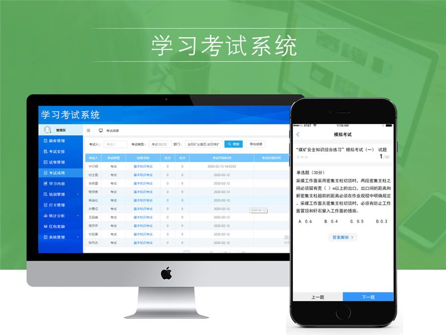 系统包括:题库管理、考试安排、试卷管理、考试成绩、学习内容、培训管理、打卡管理、统计分析等模块。