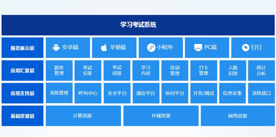 系统包括:题库管理、考试安排、试卷管理、考试成绩、学习内容、培训管理、打卡管理、统计分析等模块。
